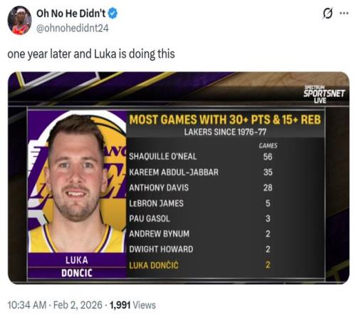 憑借這樣的表現(xiàn),東契奇湖人生涯第二次單場交出至少30分15板,成功追平拜納姆與霍華德并列隊(duì)史第六,奧尼爾56次第一、賈巴爾35次第二、濃眉哥28次第三、詹姆斯5次第四、大加索爾3次第五。