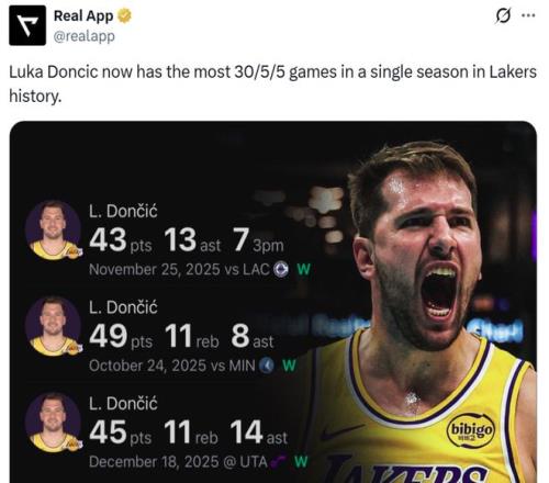同時(shí)這是東契奇本賽季第27次單場交出至少30+5+5,超越65-66賽季的杰里-韋斯特創(chuàng)造新的湖人隊(duì)史紀(jì)錄。
