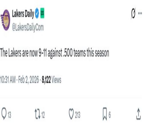 輸給尼克斯之后,湖人本賽季對(duì)陣勝率超過50%的強(qiáng)隊(duì)時(shí),戰(zhàn)績跌至9勝11負(fù),而對(duì)陣弱旅的戰(zhàn)績則為20勝8負(fù)。