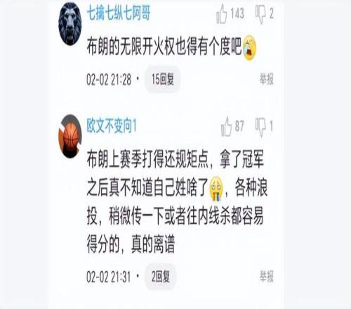 布朗是上賽季奪冠英雄,被評為總決賽MVP。但從此也飄了,飄得似乎不知自己姓什么了。球迷怒批道,“布朗上賽季打得還規(guī)矩點,拿了冠軍之后真不知道自己姓啥了,各種浪投,稍微傳一下或者往內線殺都容易得分的,真的離譜”、“布朗的無限開火權也得有個度吧”。廣廈再任由布朗這么打,這賽季完了,最近幾場都沒什么配合,全是掄,都想當大哥,心態(tài)完全不對,太飄了。