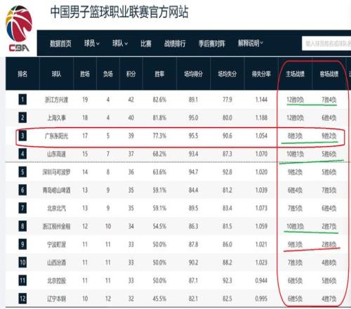 是什么數(shù)據(jù)呢?那就是本賽季,開賽至今,CBA20支球隊,只有廣東隊的主場成績不如客場成績!你沒有聽錯,廣東隊是CBA聯(lián)賽唯一一支客場成績比主場成績好的球隊。