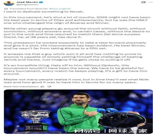 José Morón的文中最有遠(yuǎn)見的部分,或許是對(duì)德約科維奇歷史地位的預(yù)判:“或許現(xiàn)在很多人還沒(méi)意識(shí)到,但隨著時(shí)間的推移,終將有人領(lǐng)悟他多年來(lái)在網(wǎng)壇精彩表現(xiàn)的非凡意義——擁有他征戰(zhàn)網(wǎng)壇的歲月何其珍貴。”