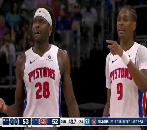 次節(jié)比賽,活塞進(jìn)攻回暖首次單節(jié)得分30+,且限制奇才首次單節(jié)得分不足25分?;钊?分鐘被拉開(kāi)23-45落后22分差距,活塞一波6-0攻勢(shì)追分,奇才連得5分?jǐn)U大21分優(yōu)勢(shì),活塞強(qiáng)勢(shì)打出一波23-3攻勢(shì)追到僅差1分。萊利三分命中,活塞單節(jié)31-22追回9分,上半場(chǎng)結(jié)束活塞追到52-56落后奇才。前兩節(jié)比賽,奇才三分22中8,尚帕尼3記三分14+6;活塞三分僅17中2,坎寧安10中4得到12+6+3+1帽。
