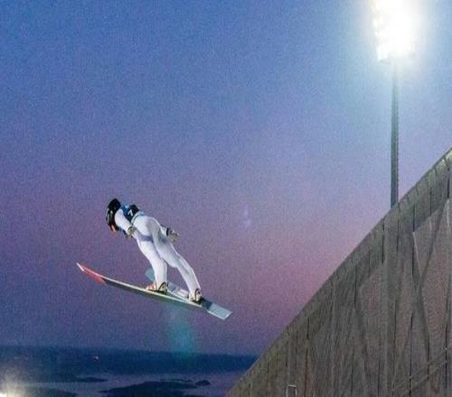 隨后憑著慣性從跳臺邊緣一躍而出,在空中滑翔一段距離后,最后降落到雪地上。