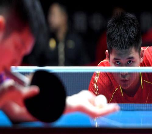 在河南新鄉(xiāng)市舉行的2021“直通WTT大滿貫·世乒賽”暨奧運模擬賽男子單打四分之一決賽中,林詩棟(右)在比賽中準(zhǔn)備接樊振東的發(fā)球。新華社記者 李安 攝