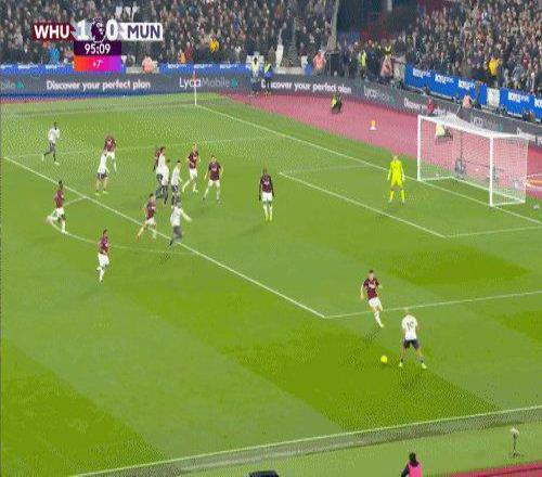 第50分鐘,鮑文右路低平球傳中,前點(diǎn)紹切克搶點(diǎn)將球捅入,西漢姆1比0曼聯(lián)。
