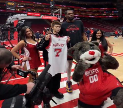 這場比賽之前中國娛樂明星任嘉倫來到火箭主場與凱文-杜蘭特進(jìn)行了互動,他為杜蘭特送上了唐裝,杜蘭特也將自己火箭7號球衣送給他,任嘉倫還表示這是按照杜蘭特2.11米的尺寸定做的,杜蘭特表達(dá)了感謝,杜小帥還說希望跟任嘉倫一樣帥。