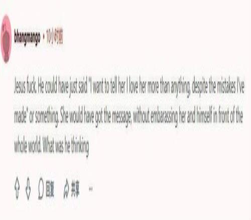 “我的天,他明明可以說(shuō)‘我想告訴她,盡管我犯了錯(cuò),但我愛(ài)她勝過(guò)一切’之類的話。這樣她就能明白他的心意,又不必在全世界面前讓彼此難堪了。他到底在想什么?”