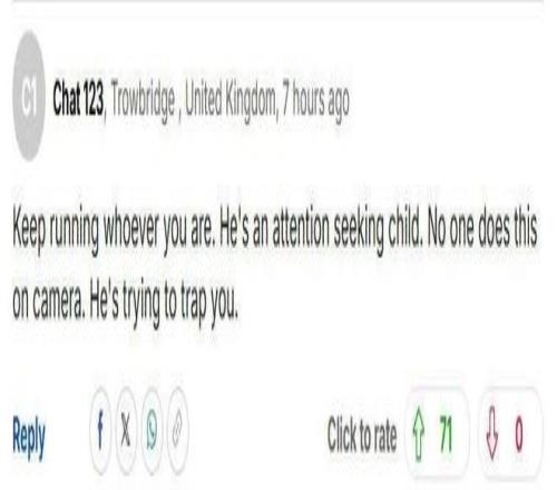 “姑娘,不管你是誰(shuí),趕緊跑。這就是個(gè)愛(ài)出風(fēng)頭的小屁孩。沒(méi)人會(huì)在鏡頭前做這種事的,他就是在傷害你?!?/p>