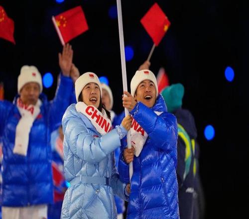 當?shù)貢r間2月6日,張楚桐和寧忠?guī)r(右)作為中國代表團旗手在2026年冬奧會開幕式上入場。