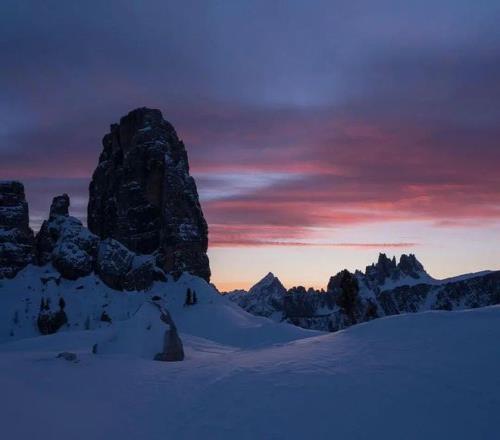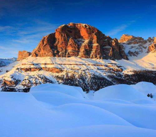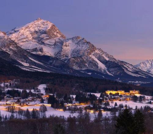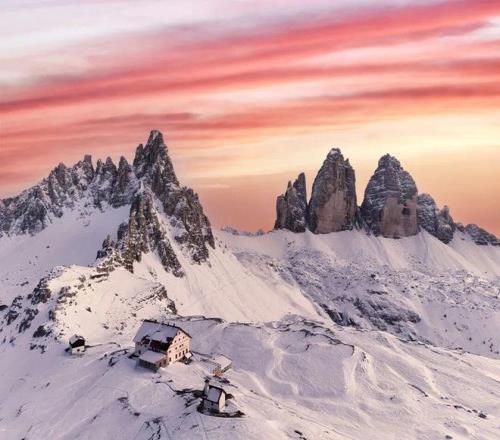 理解科爾蒂納為何成為滑雪圣地,必須從認(rèn)識(shí)多洛米蒂開(kāi)始。這片山脈以18世紀(jì)法國(guó)地質(zhì)學(xué)家德奧達(dá)·德·多洛米厄命名,其獨(dú)特的白云巖構(gòu)成了它標(biāo)志性的淺色肌理,在日光下宛如“蒼白山脈”。然而,自然的魔法在晨昏上演:當(dāng)太陽(yáng)光線低角度掠過(guò),整片山體會(huì)被瞬間“點(diǎn)燃”,從柔和的粉金色漸變?yōu)闊肓业幕鸺t。這場(chǎng)每日兩次的光影戲劇,被當(dāng)?shù)厝朔Q為 “Enrosadira”,阿爾卑斯夕照,也讓這里的每一次滑行,都能邂逅粉金霞光相伴的浪漫。