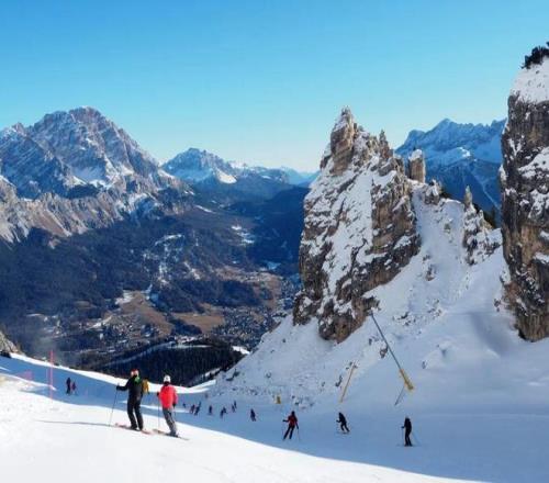 科爾蒂納值得奔赴的三條特色雪道,各有風(fēng)情:作為小鎮(zhèn)的標(biāo)志性雪道,托法納山“Canalone”黑道,早已超越了普通滑雪道的意義,成為專業(yè)玩家心中的“打卡圣地”,更是雪后社交場(chǎng)上最具分量的談資。它如一條黑色的綢帶鑲嵌在白雪皚皚的山間,以其極具挑戰(zhàn)性的坡度聞名,最大坡度接近40度,雪質(zhì)松軟卻不失韌性,既能給滑雪者帶來(lái)極速下滑的刺激,又能通過(guò)雪面的反饋?zhàn)尲记傻靡猿浞终宫F(xiàn)。站在雪道起點(diǎn),腳下是綿延至山谷的白色世界,遠(yuǎn)處的多洛米蒂群山層巒疊嶂,巖石與白雪交織出雄渾壯麗的畫(huà)卷。