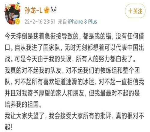 賽后,孫龍淚灑賽場(chǎng),在個(gè)人社交媒體上連用六個(gè)"對(duì)不起"向國(guó)家和隊(duì)友致歉。這次失誤讓他陷入了職業(yè)生涯的低谷——經(jīng)驗(yàn)欠缺、心態(tài)不沉穩(wěn)、外界的質(zhì)疑聲鋪天蓋地而來(lái)......