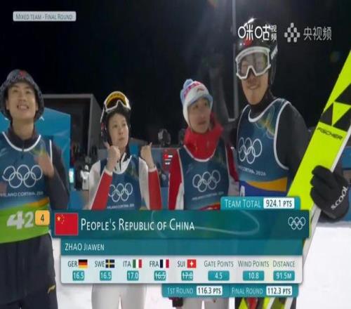 在跳臺滑雪混合團體比賽中,由曾坪、宋祺武、劉奇、趙嘉文組成的中國隊,也以總分924.1的成績獲得第8名,刷新中國體育代表團冬奧會該項目的最好成績。