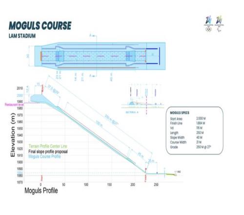 賽道長度被嚴格規(guī)定不能少于250米(普通國際賽事范圍通常在235米±35米),平均坡度要維持在28°±4°,斜面上均勻分布著密集的雪包, 雪包之間的中心距離通常設定在3.5米至4米之間,這個距離是根據(jù)頂尖選手的滑行速度(男選手約11-12米/秒,女選手約10米/秒)計算出來的。除了連貫的雪包,賽道還嵌入了兩個關鍵的空中動作跳臺。第一個跳臺位于賽道總長約15%處,第二個則設在離終點約20%處。|奧運會官網(wǎng)