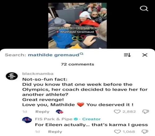 賽后,有網(wǎng)友在國(guó)際雪聯(lián)(FIS)官方社交媒體賬號(hào)評(píng)論區(qū)留言稱:"冷知識(shí):你知道嗎?在奧運(yùn)會(huì)前一周,她的教練決定離開(kāi)她,去執(zhí)教另一名運(yùn)動(dòng)員。這復(fù)仇太解氣了!愛(ài)你,馬蒂爾德,這是你應(yīng)得的!"